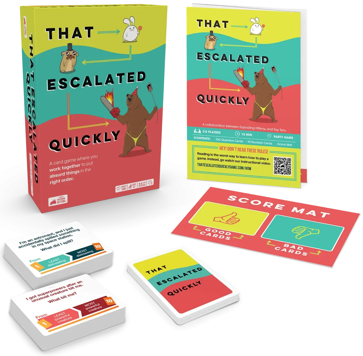 To play That Escalated Quickly, read out a simple question (ex. I’m locked in a tiny room. What else is locked in here with me from cutest to scariest). Then everyone is assigned a secret number from one to ten. Next, each player answers the question, and the intensity of that answer is based on their secret number (ex. 1= a bunny, 10= a grizzly bear with chainsaw arms.) Finally, the person who read the question has to try and sort those answers into the correct order. If they get it right, everyone wins! This game is hilarious, energetic, and a great way to get to know your friends and family a little bit better.