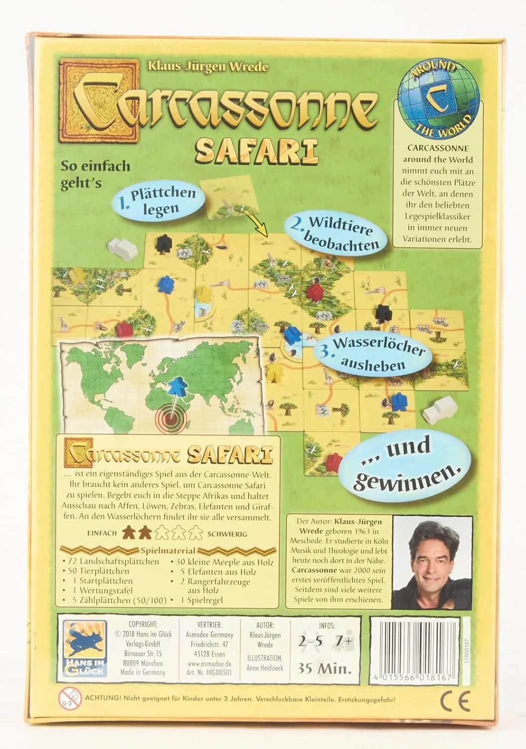 In the standalone game Carcassonne: Safari, players go out on a safari and try to see as many animals as they can, despite these animals hiding in the bush, in the savannah, or near watering holes. Help your friends to dig out such holes and receive bonus points. Sometimes you will see animals while taking a nap under a big baobab.