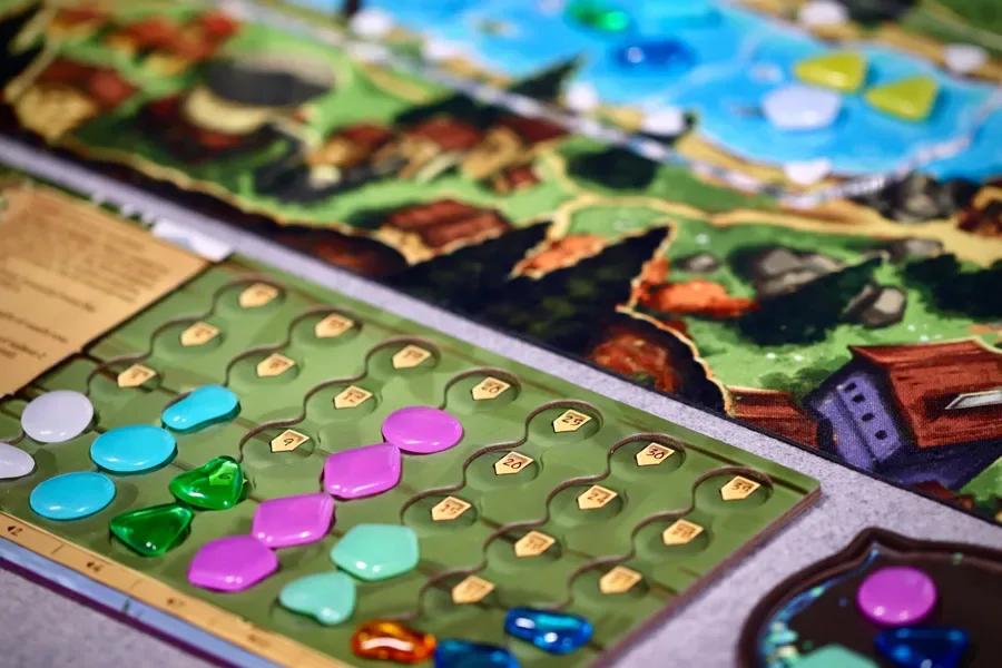 In River Valley Glassworks, you either place a token from your hand onto one of 6 river tiles and collect tokens from one of the two adjacent river tiles, or you take tokens from the lake to replenish your supply. Tokens collected are slotted into your player board according to color or scarcity. Points are scored based on completed rows and scored for your two tallest collumns, with ties broken in favor of the lowest or furthest left collumns.
