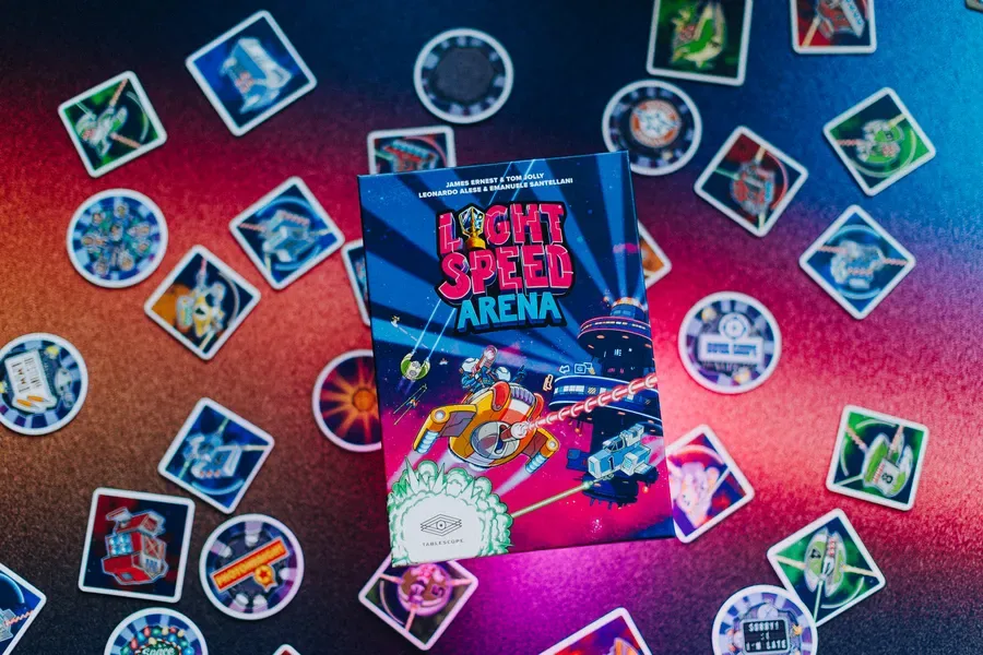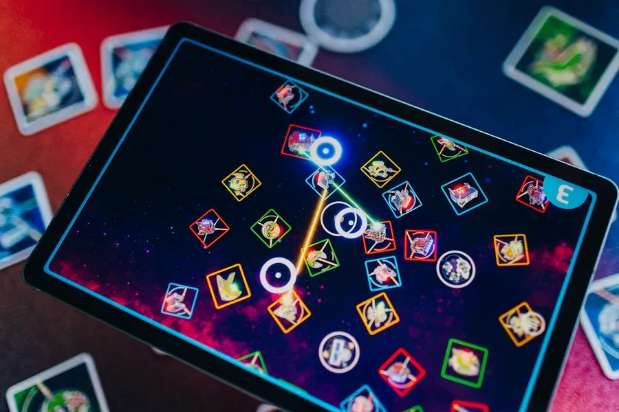 A real-time tabletop shooter in which you aim with your tiles and take a smartphone picture to let the app unfold the battle for you. As the roar of the crowd resonates, the arena is lit with the brilliant glow of sponsor ads: Pick your faction and step into battle. Tactically place and orient your spaceships to score the most points by taking down enemy vehicles, collecting mineral units from asteroids, and impressing the game sponsors.