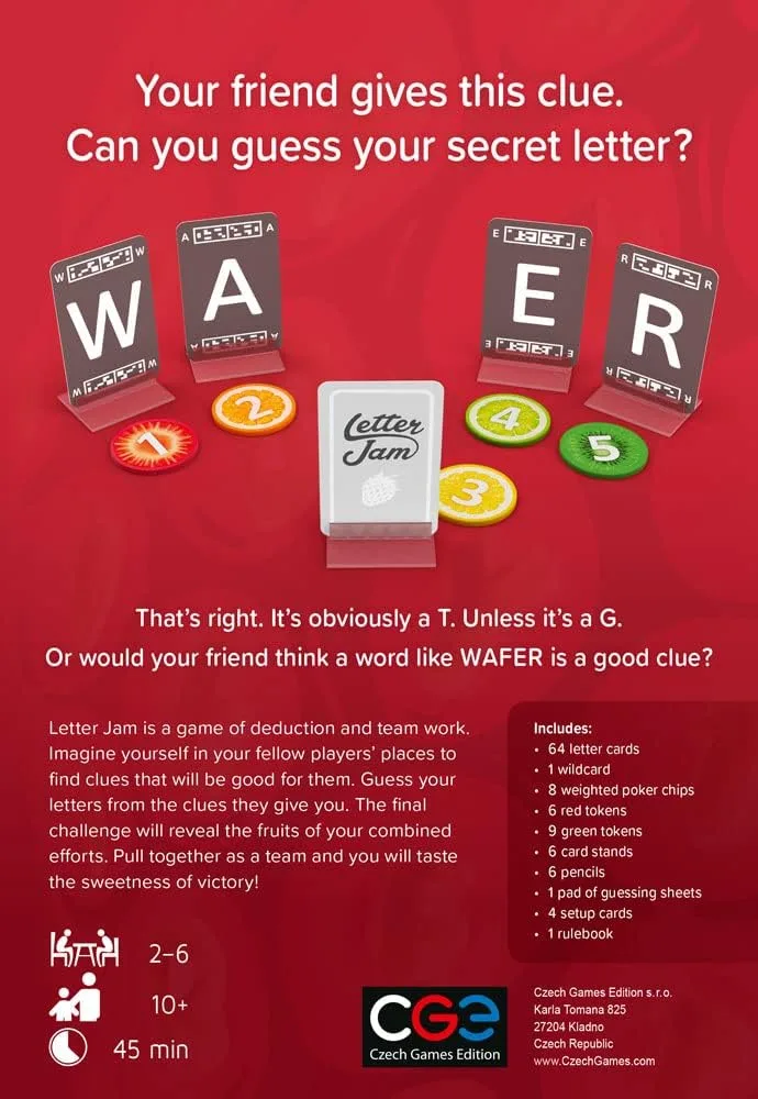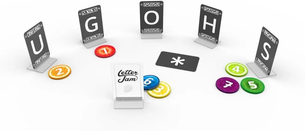 Letter Jam is a 2-6 player cooperative word game where players assist each other in composing meaningful words from letters around the table. The trick is holding the letter card so that it’s only visible to other players and not to you.