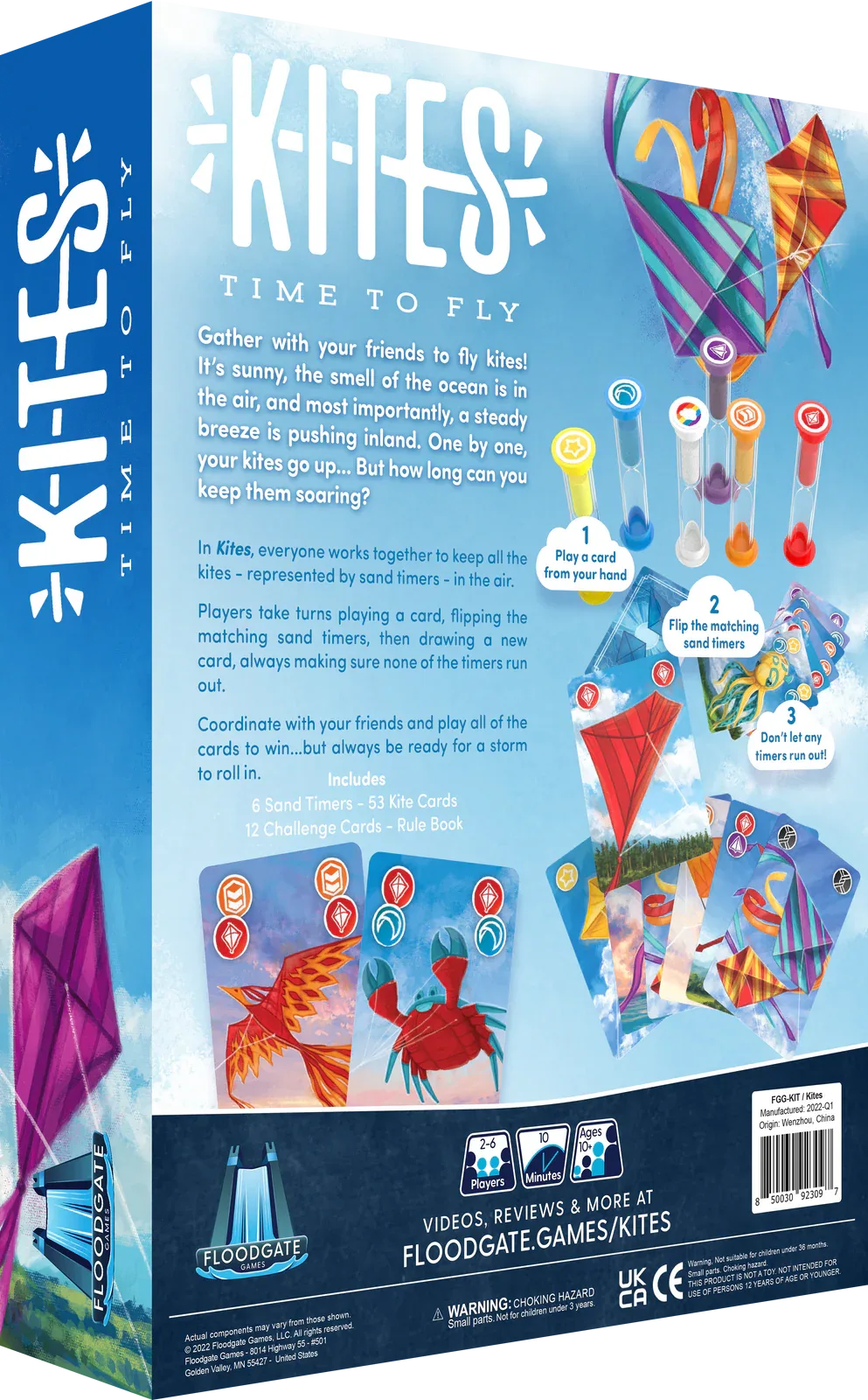 In Kites, everyone works together to keep all their kites — represented by colorful sand timers — in the air. Take turns playing cards, flipping the sand timers, and coordinating with other players to ensure none of the timers run out. If it does, a kite has crashed! Add complication cards for additional challenges.