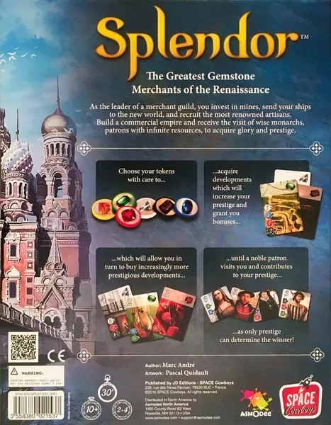 Splendor is a game of chip-collecting and card development. Players are merchants of the Renaissance trying to buy gem mines, means of transportation, shops—all in order to acquire the most prestige points. If you're wealthy enough, you might even receive a visit from a noble at some point, which of course will further increase your prestige.