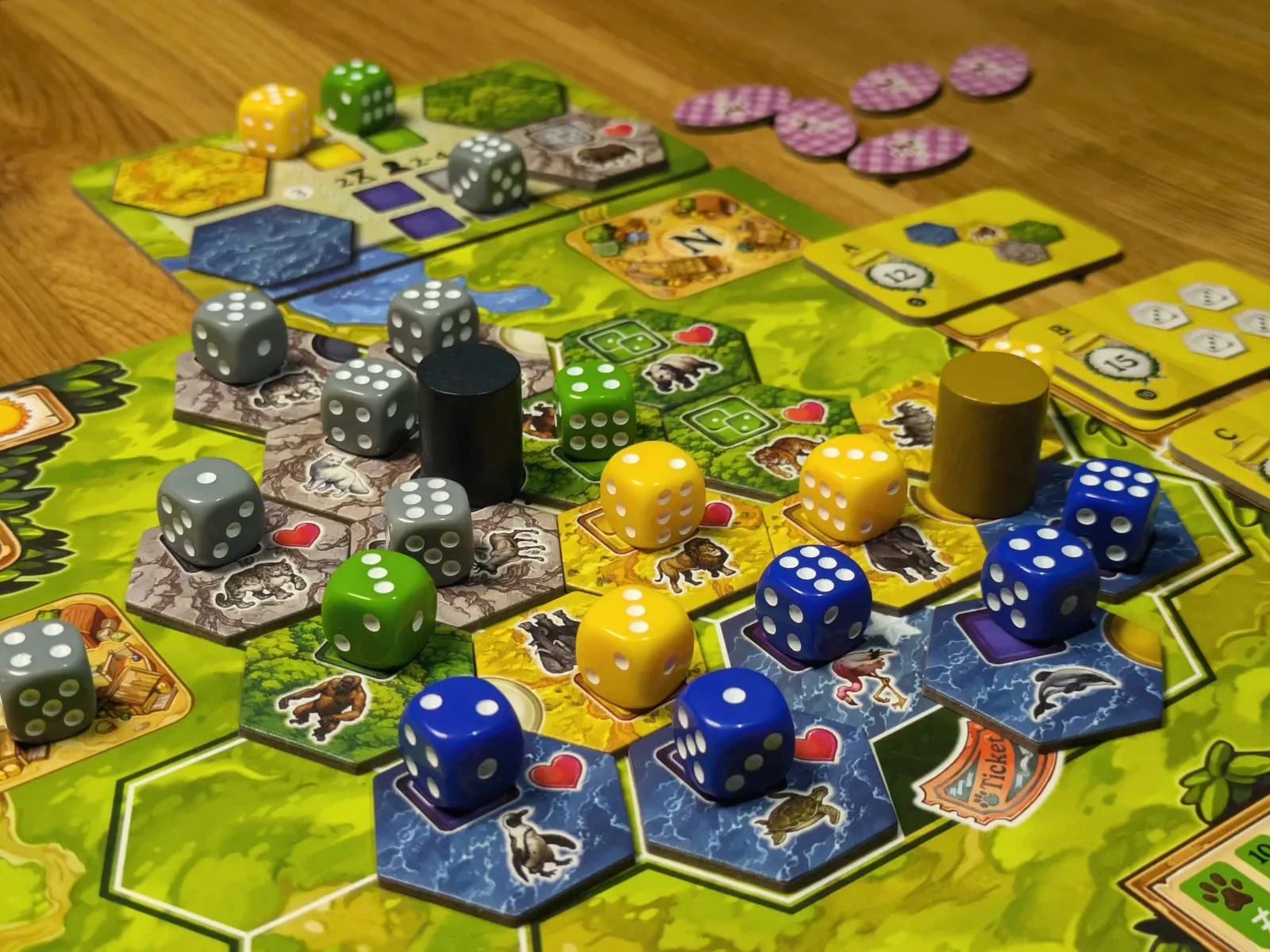 During the game, you select animal tiles and dice, where the dice represent food for the animals. The color of the dice must match the habitat color of the animal tiles. Each turn provides crucial decision-making where you need to consider whether to draft a die of a certain value or ensure an animal tile which may not be available again.