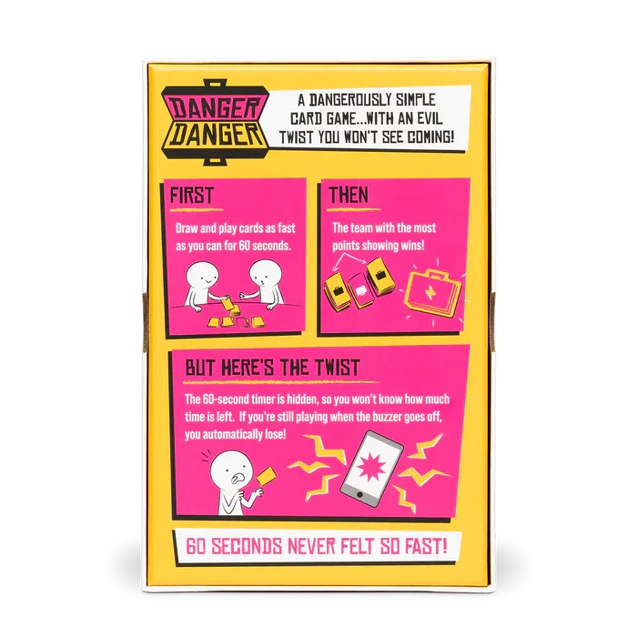 Danger Danger is a one-minute card game with an evil twist you won't see coming. Players draw and play cards as quickly as they can for 60 seconds. Each card is worth a number of points, and the team with the most points showing at the end of the game wins. However, the timer in the game is hidden, so players never know how much time is left. If you're still playing when the buzzer goes off, you instantly lose!