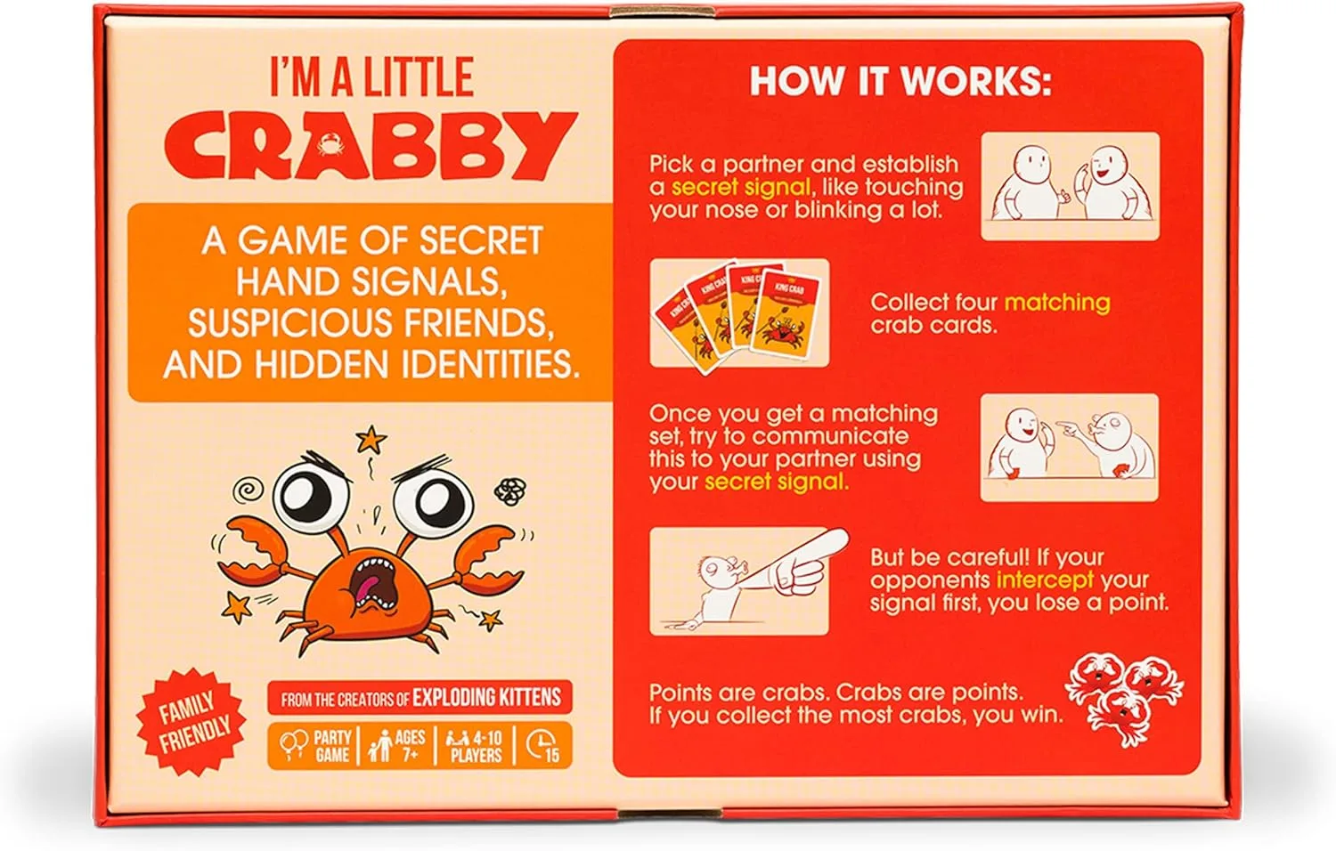 Form teams of two players each (max of 5 teams). Each team meets privately to come up with a non vocal signal to indicate when either teammate collects 4 of the same Crab Card.