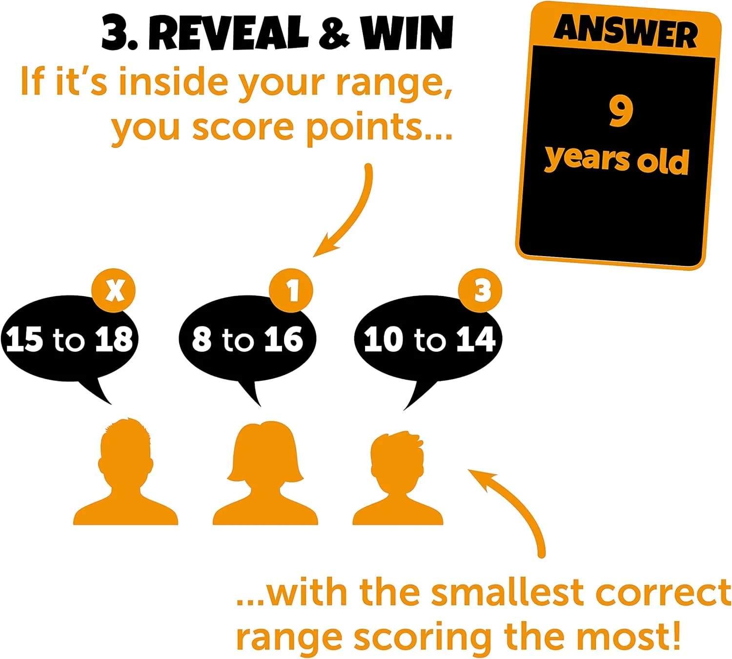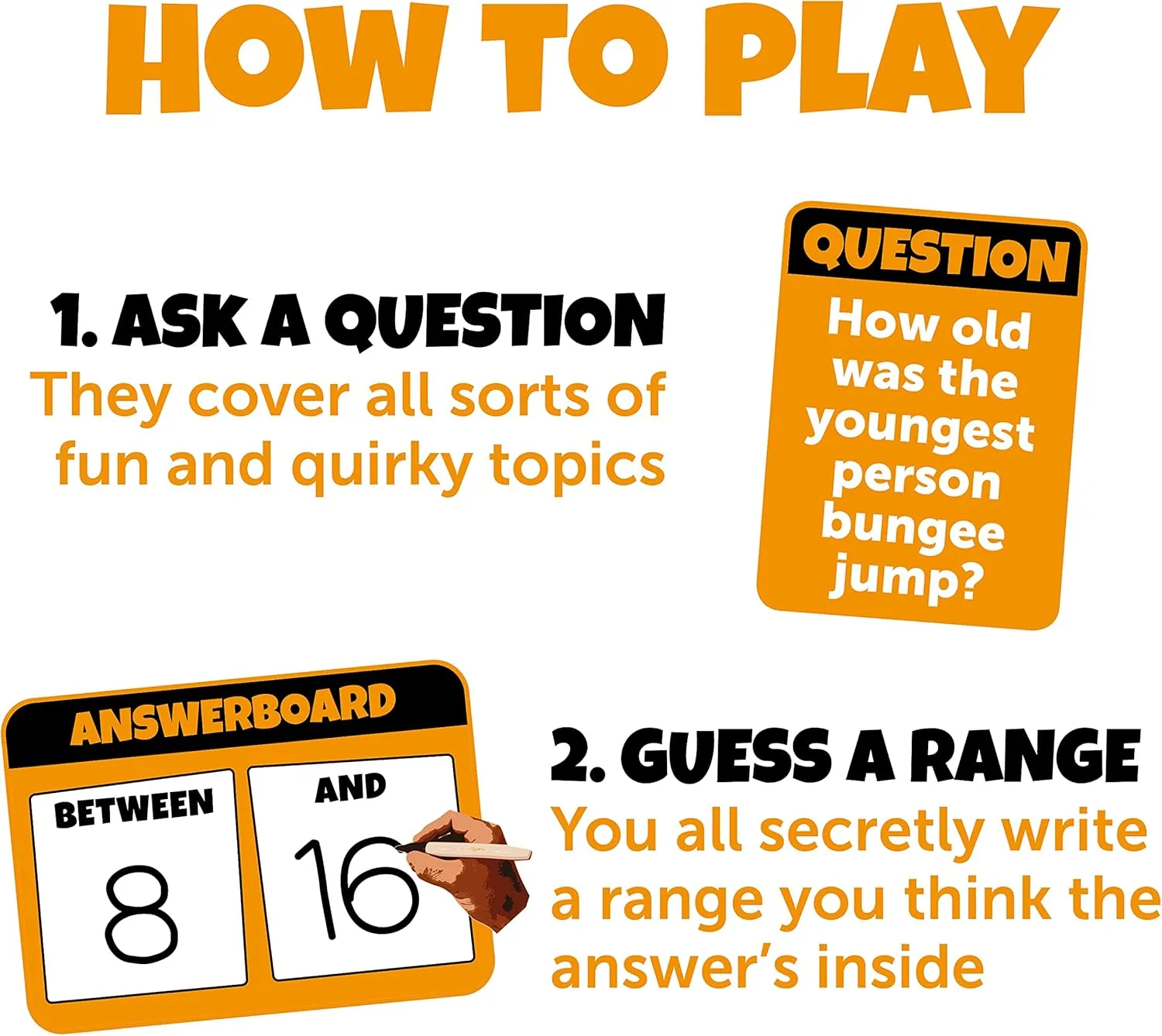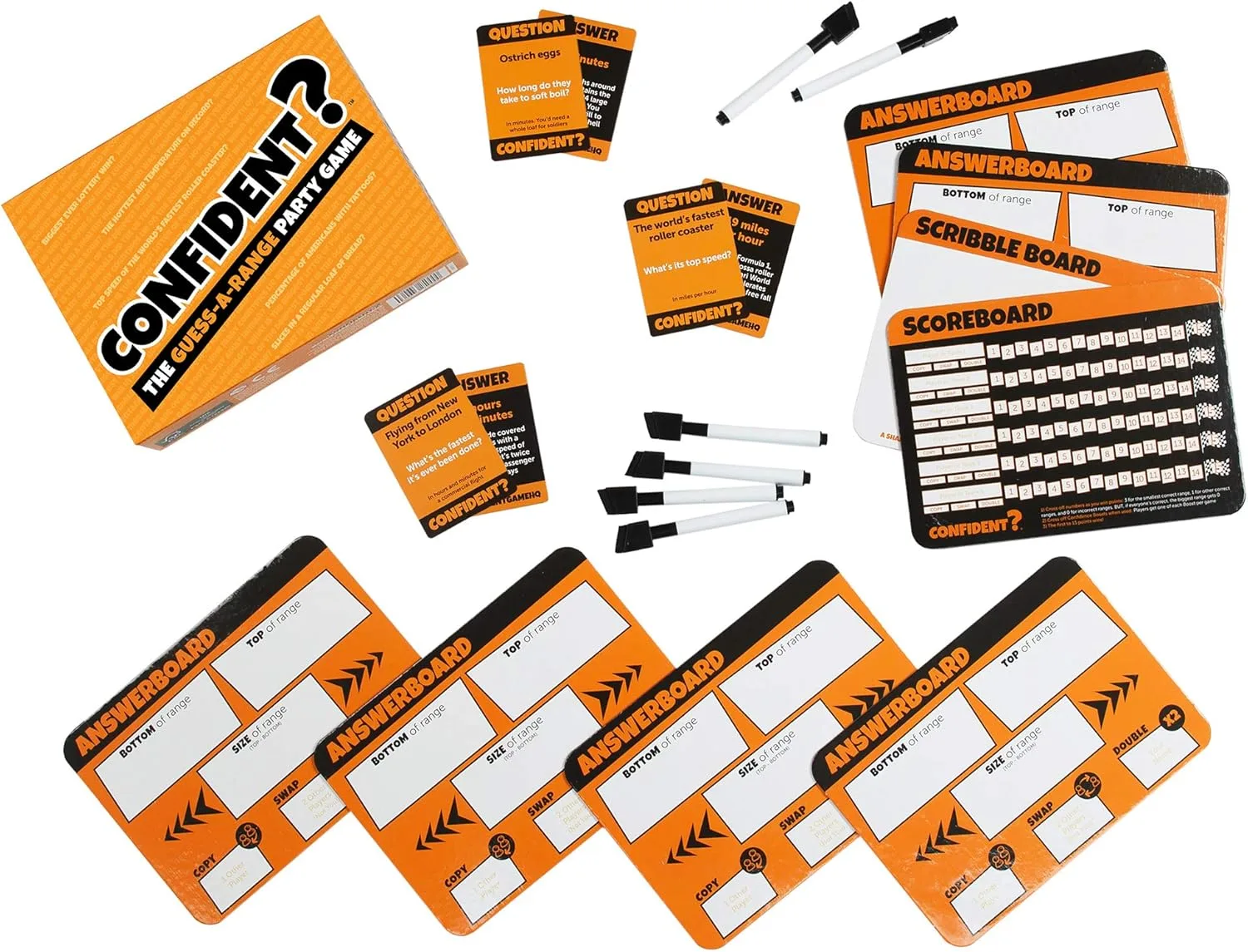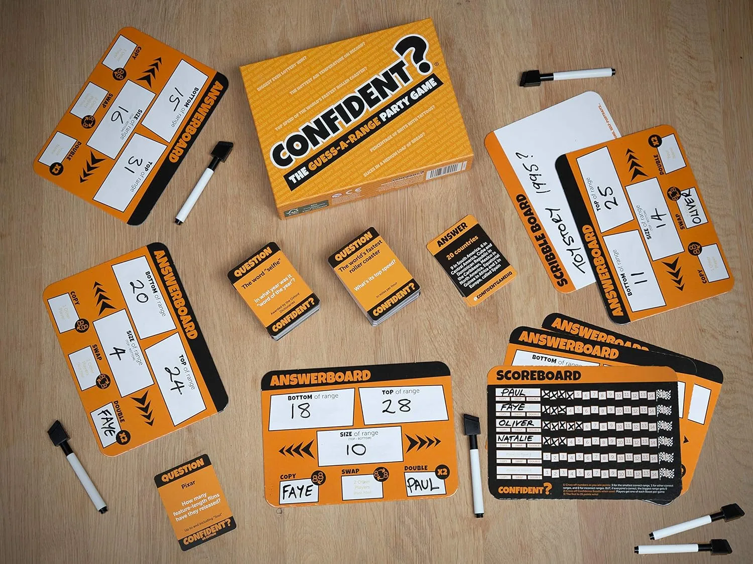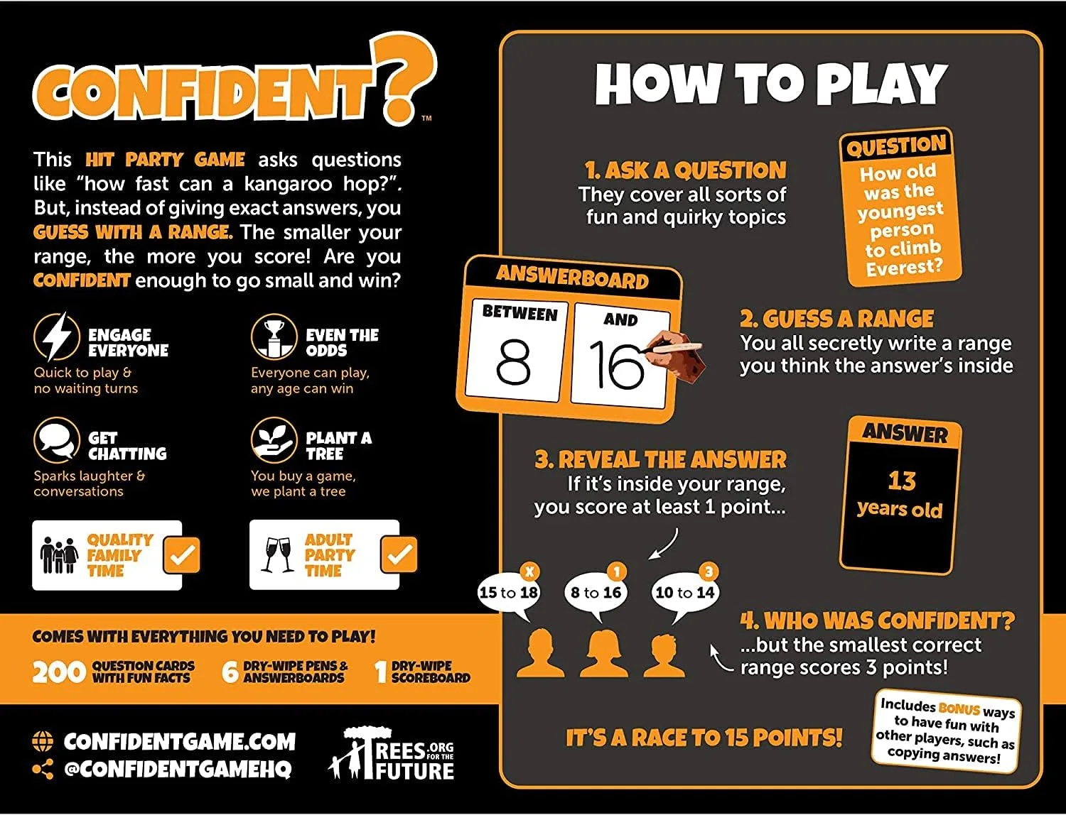 CONFIDENT? is a highly entertaining family party game where you answer questions like "how many slices are there in a loaf of bread?". But, instead of giving exact answers, you guess with a RANGE! You only need to get the right answer in your range to win points so everyone can have a go, but the smaller your range compared to everyone else, the more you score! Are you CONFIDENT enough to win?