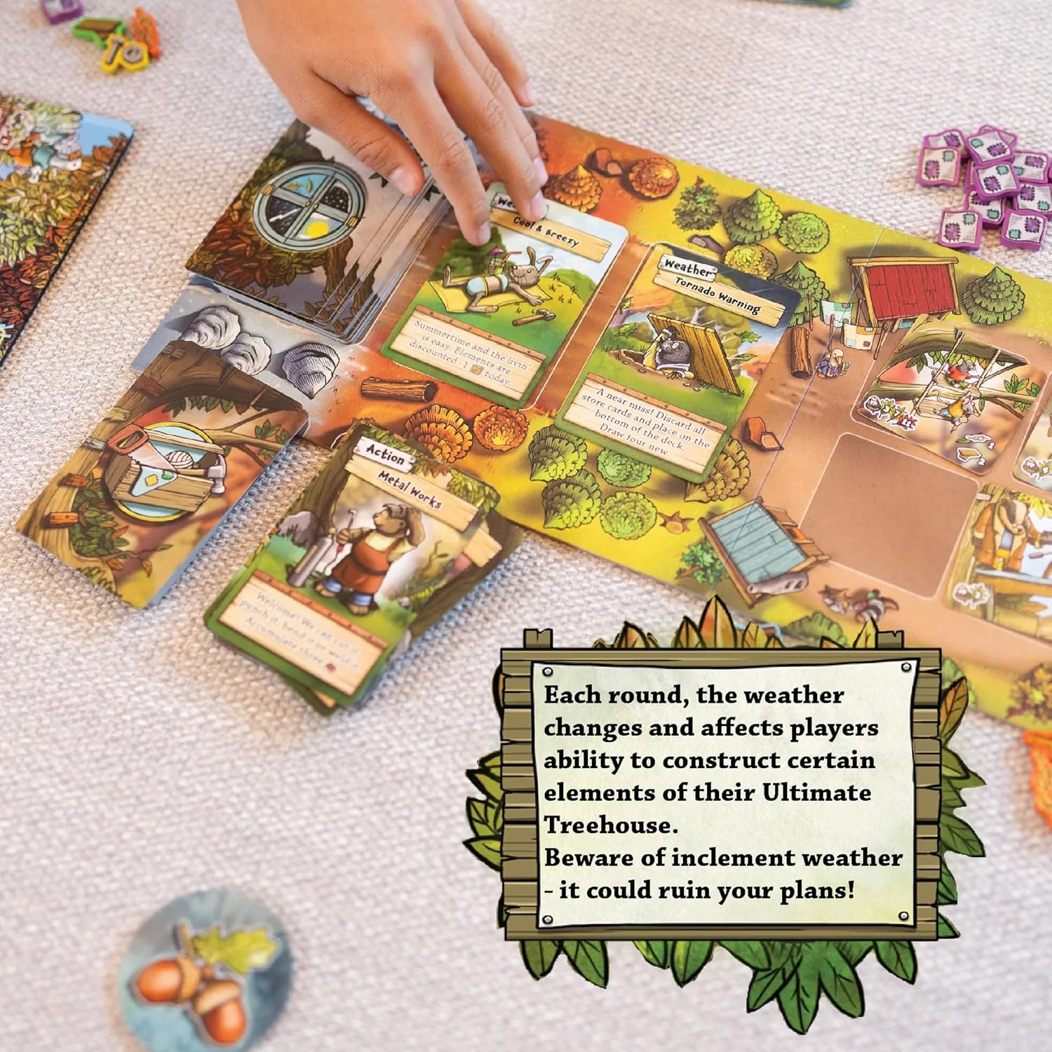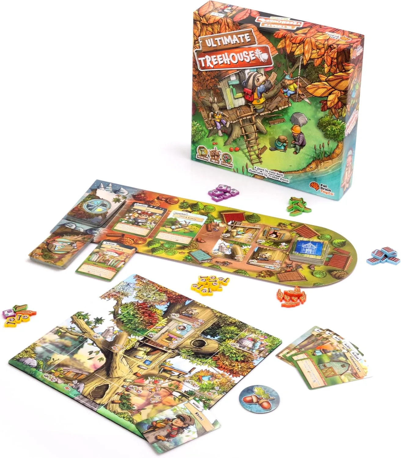 Play Action cards from your hand to accumulate the resources (Wood, Metal, Fasteners, Fabric, and Rope) required to build any or all of the fourteen different treehouse elements in your quest to build the Ultimate Treehouse.