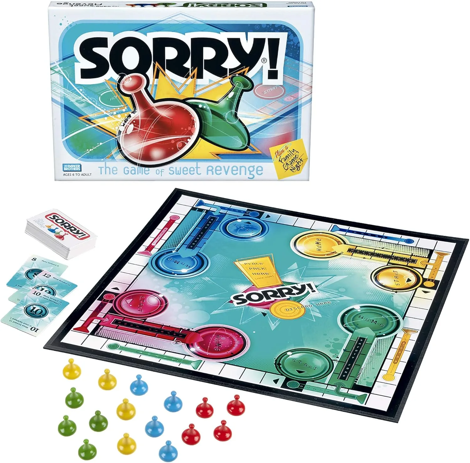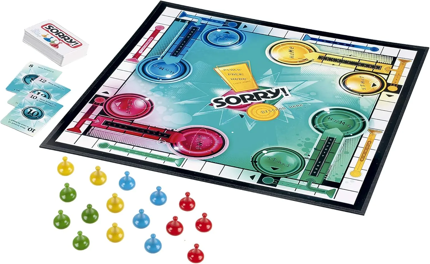Race your four game pieces from Start around the board to your Home in this Parchisi type game. By turning over a card from the draw deck and following its instructions, players move their pieces around the game board, switch places with players, and knock opponents' pieces off the track and back to their Start position.