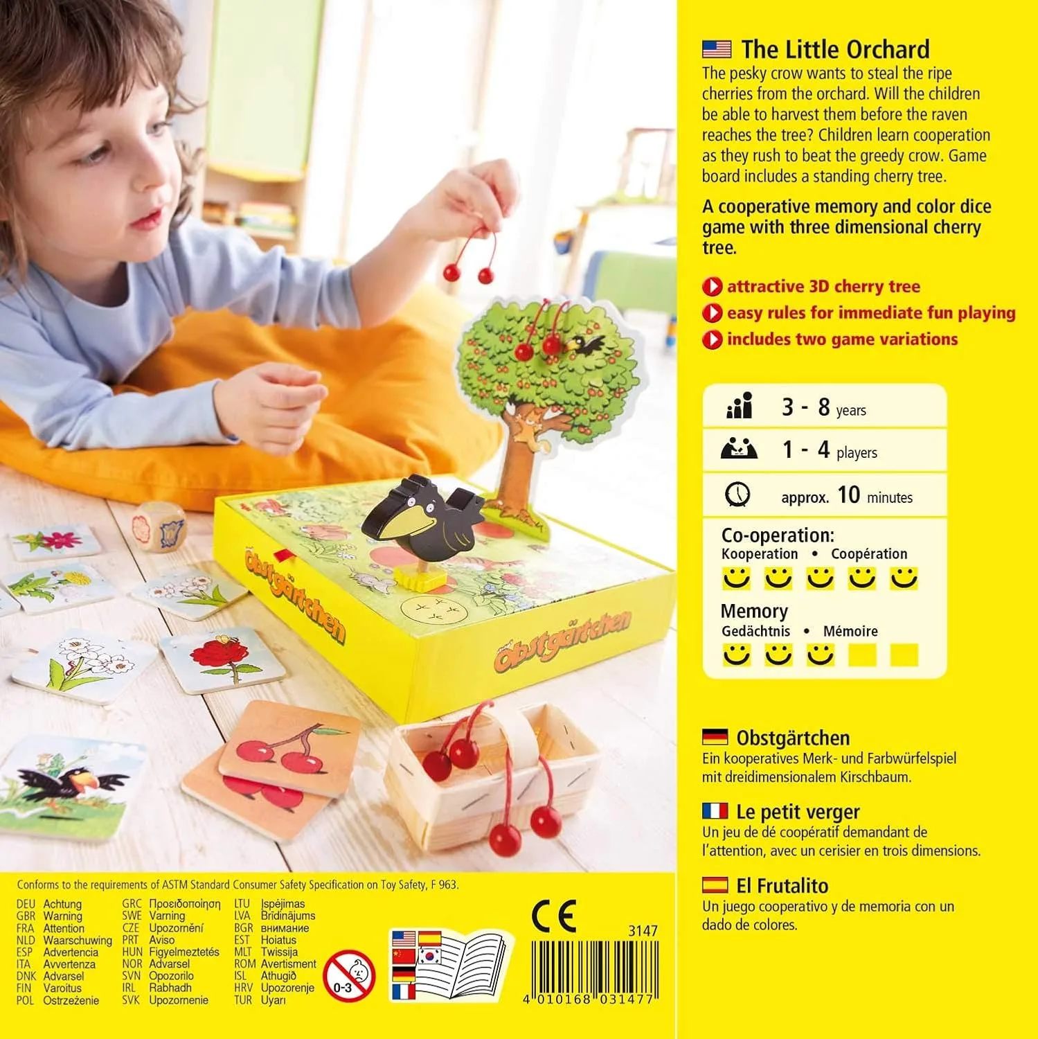 A cooperative game for children. The players have to pick up all the cherries, before the crow can steal them from the tree. With good memory and a little bit of deduction, the game can be won, but if you forget which tiles have the crow on the other side, watch out! He'll eat all your cherries!