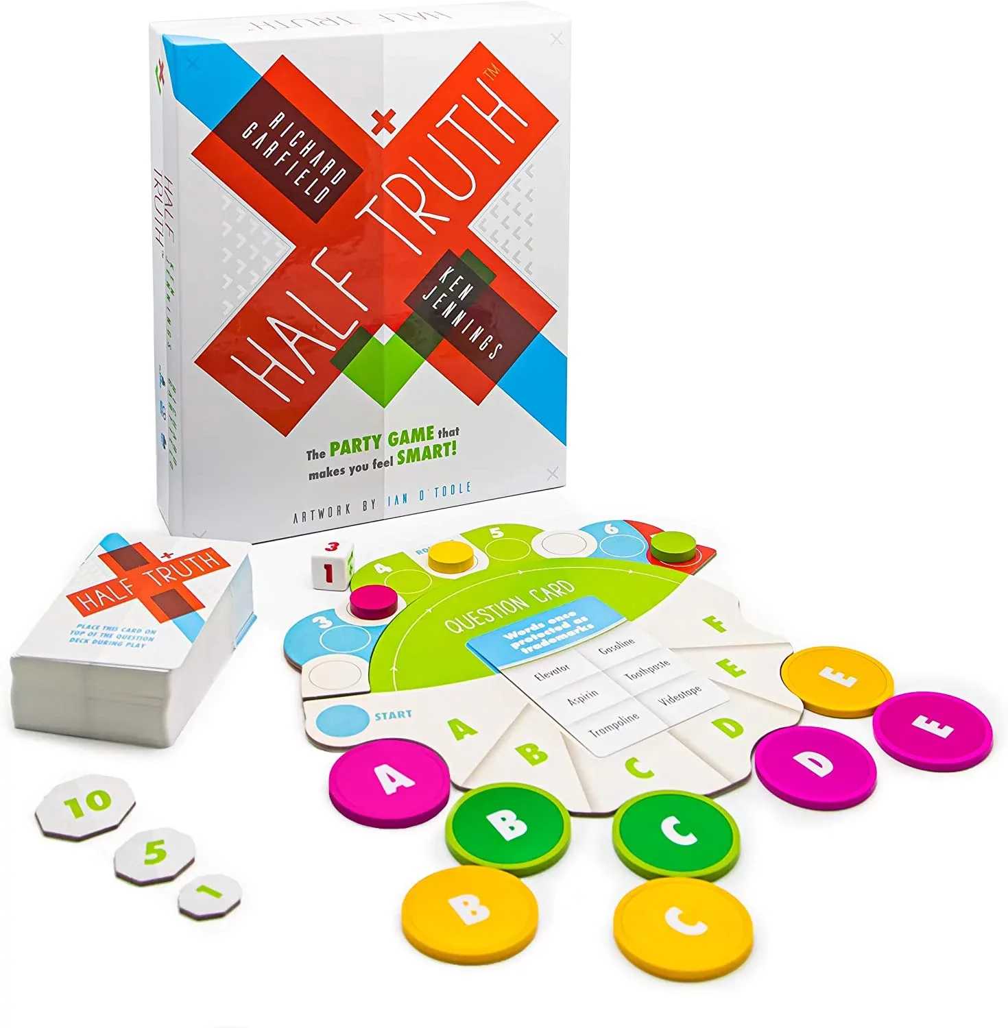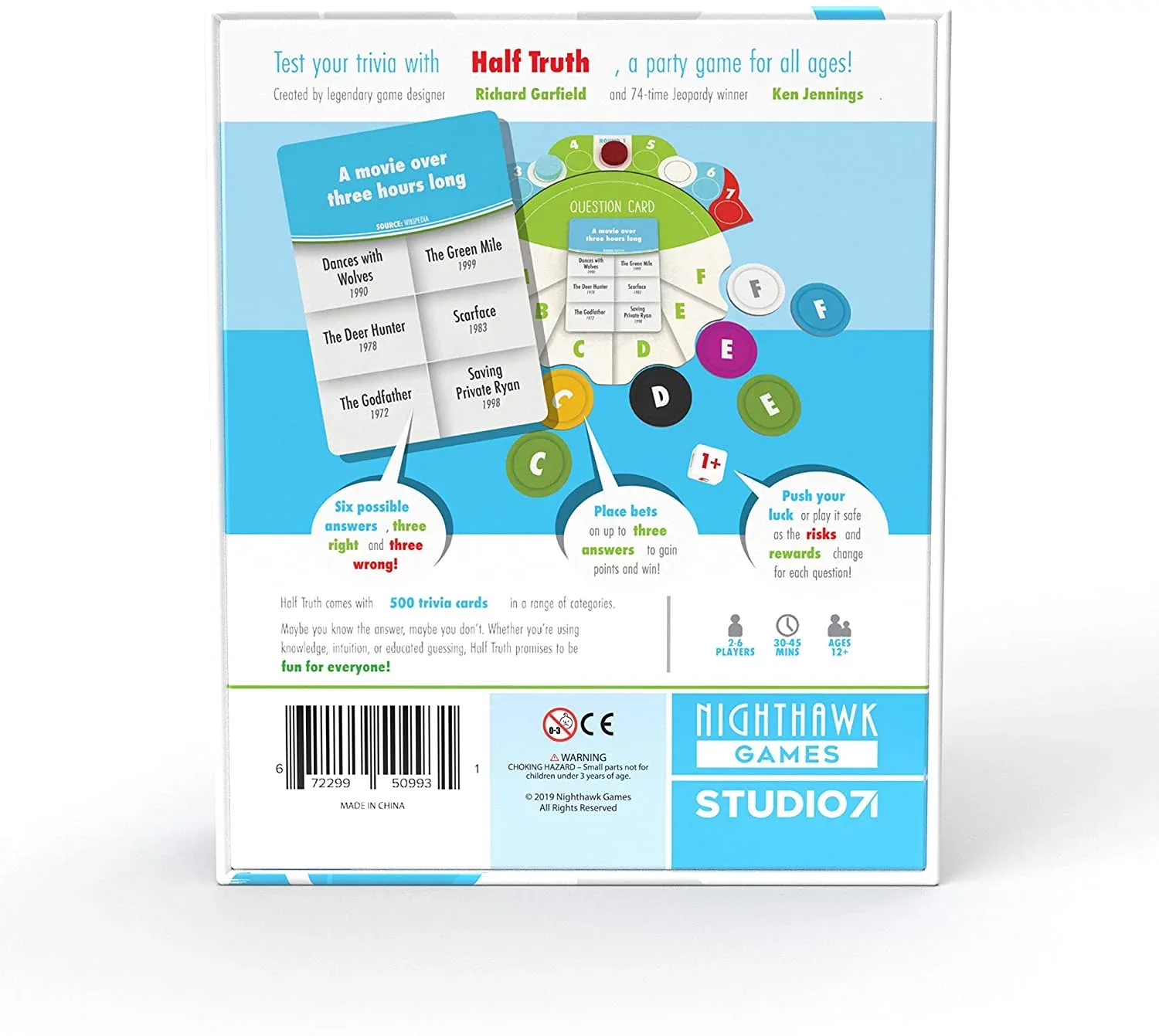 Half Truth is a party game for all ages and people, created by legendary game designer Richard Garfield and 74-time Jeopardy winner Ken Jennings. With art by well-known artist Ian O'Toole, the game comes with 500 trivia question cards and each card has a category on it, like "Animals with blue tongues." There are six possible answers, three right and three wrong, and players have to place bets on answers they believe are correct.