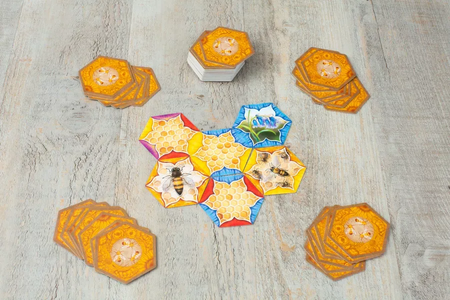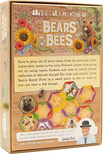 Build "hivalries" with your opponents as you race to be the first to play all your cards in this beautiful and strategic tile-laying game. Each game begins with the Queen Bee at the center of the hive and with every passing turn cards are added to the hive by players who connect matching, or wild, colors on their edges with other cards in play. Every card played must connect with at least 2 other cards, and every side that connects with another card must match. Match more than two sides and you'll earn a bonus play. String those bonus plays together and you can leave your opponents behind in your trail of pollen! Be careful though, attack cards played by your rivals, like Flowers, Worker Bees, and the dreaded Bears can sticky up your plans to go out by forcing you to draw!