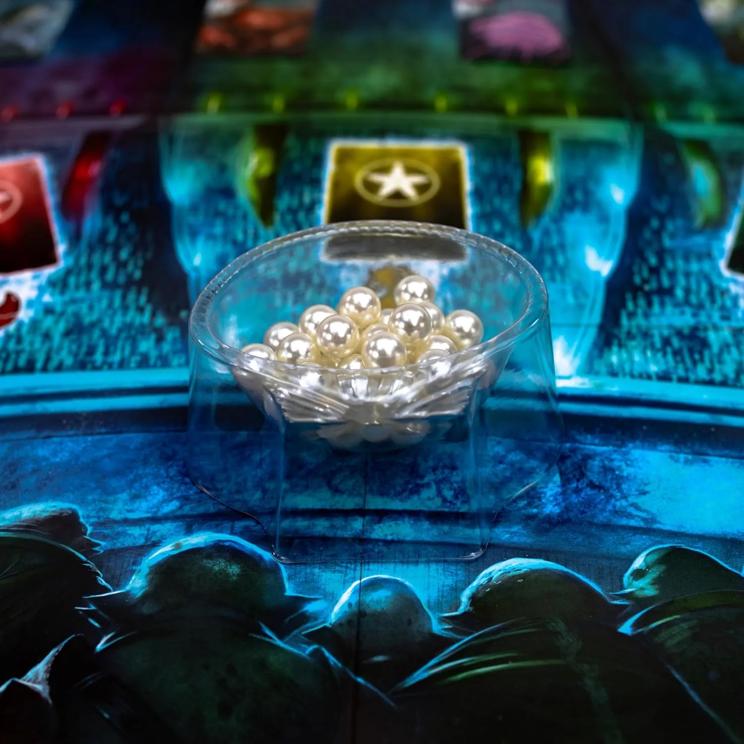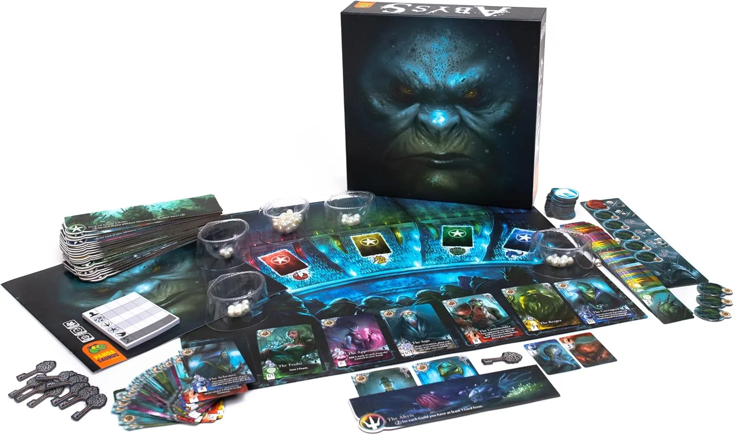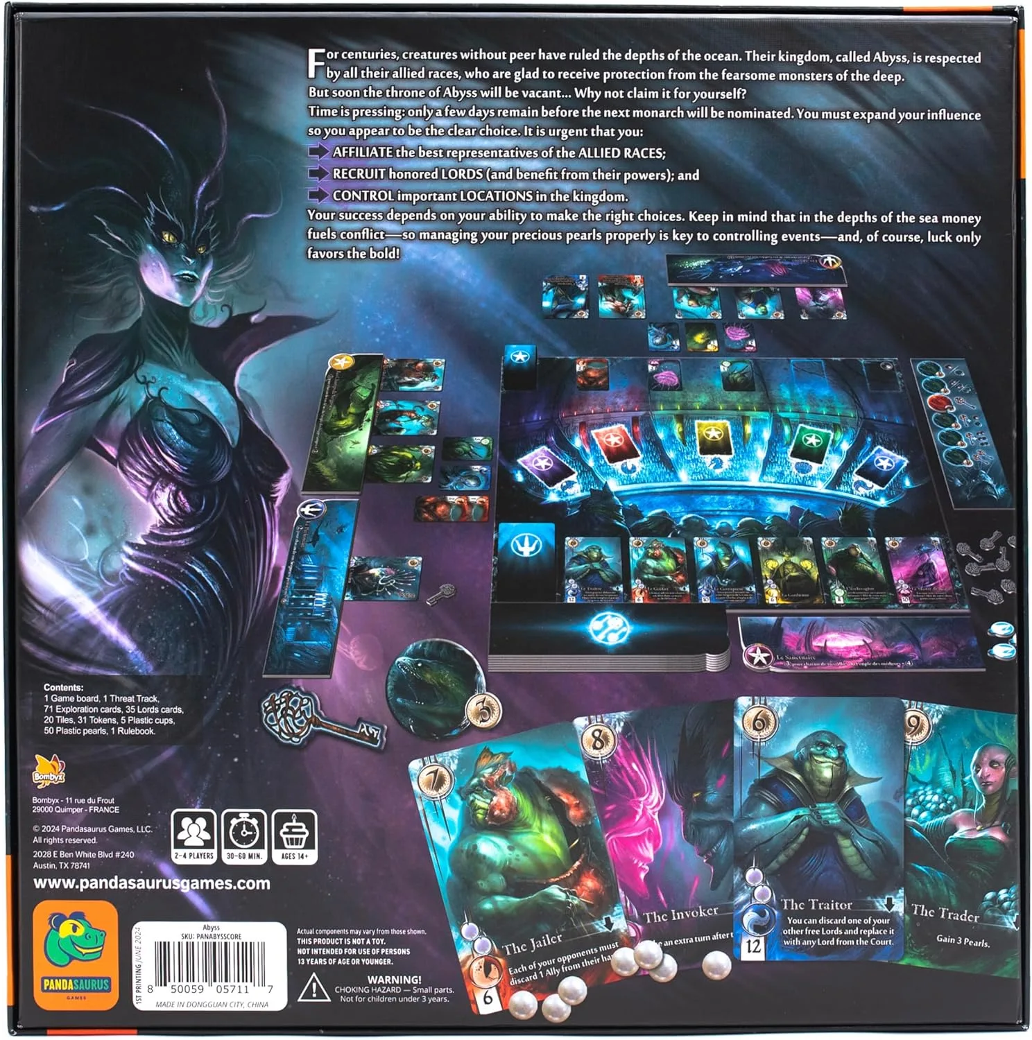 Abyss is a game of development, combination and collection in which players try to take control of strategic locations in an underwater city. To achieve this, players must develop on three levels: first by collecting allies, then using them to recruit Lords of the Abyss, who will then grant access to different parts of the city. Players acquire cards through a draft of sorts, and the Lords of the Abyss acquired on those cards grant special powers to the cardholder — but once you use the cards to acquire a location, that power is shut off, so players need to time their land grabs well in order to put themselves in the best position for when the game ends.