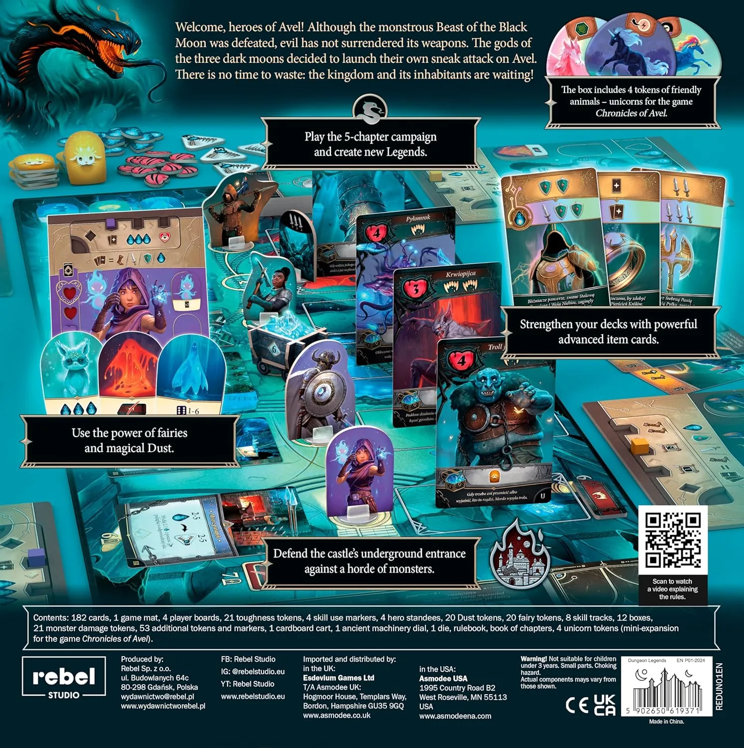 Dungeon Legends is a cooperative, standalone card-based game set in the world of Chronicles of Avel. Throughout the game, you'll take on the roles of heroes embarking on a dangerous mission deep into the dark dungeon. A fully replayable campaign of 5 engaging chapters awaits you, where you must reach the deepest depths and defeat the evil lurking there, whilst preventing monsters from reaching the Castle.