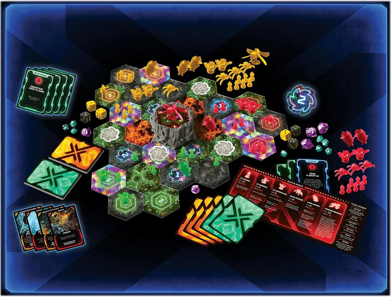 Units are composed of various alien races and have stats similar to those used in the Axis & Allies series. Combat is also similar. Players who lose battles are compensated with Energize cards which grant them special powers later. Players can also obtain Energize cards by controlling the Monolith, a raised structure in the center of the grid. The first person to reach the required number of victory points wins the game.