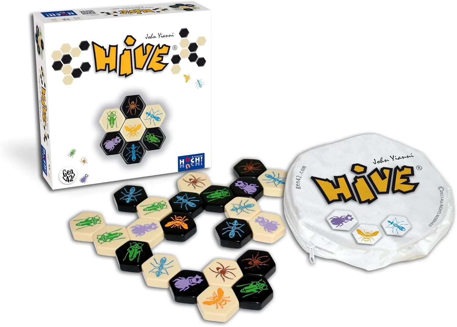 Hive is a strategic game for two players that is not restricted by a board and can be played anywhere on any flat surface. Hive is made up of twenty two pieces, eleven black and eleven white, resembling a variety of creatures each with a unique way of moving.