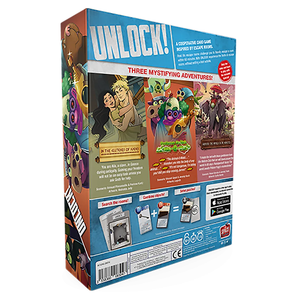 UNLOCK! Mythic Adventures is a cooperative card game inspired by escape rooms. Across three new scenarios, players search rooms, combine objects, and solve puzzles. Explore Mythic Greece in the “In the clutches of Hades” adventure! Experience “Professor Noside’s Animal-O-Matic” for an unforgettable adventure. Finally, travel “Around the world in 80 minutes” in a grand adventure inspired by Jules Verne’s famous book.
