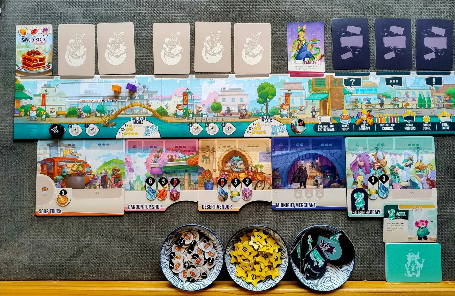 Challenges, revealed in rounds 1 through 6, offer the players opportunities to earn stars for crafting dishes with specific ingredient requirements. After round 7 the players must create an epic meal to impress the celebrity critic and cater to their appetites. A multitude of different critics, rumors and restaurateurs mean every game is fresh!