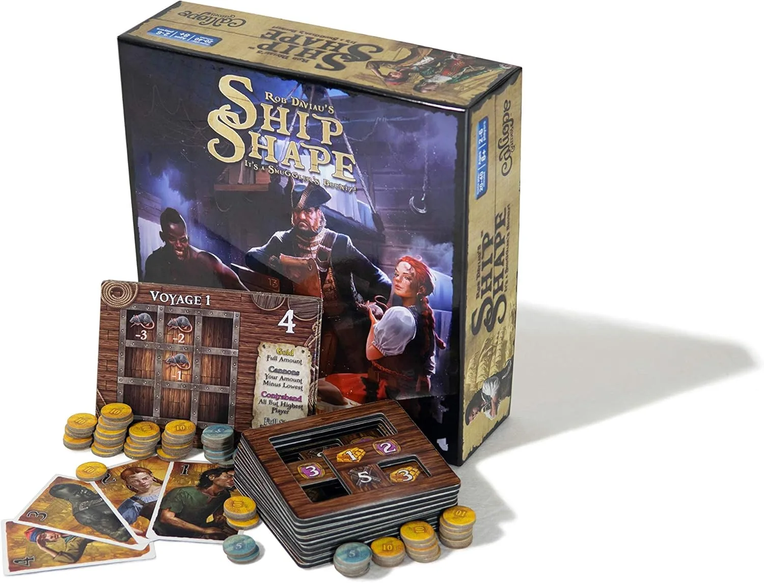 In ShipShape, 2-6 players each control a ship. Over the course of three voyages (rounds), you bid using numbered crew cards to claim unique crate tiles off the central stack. Fill your hold with gold, cannons, and contraband and cover up what you don't want. At the end of each voyage, score coins by comparing your holds with everyone else, looking only at what is visible in your hold.