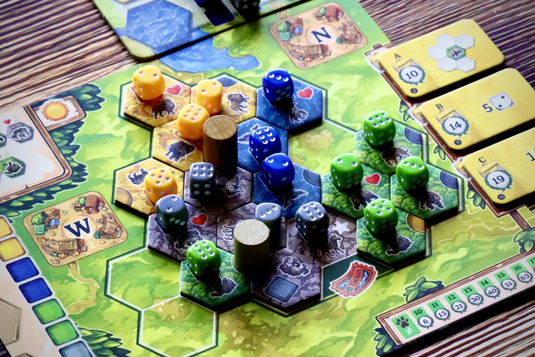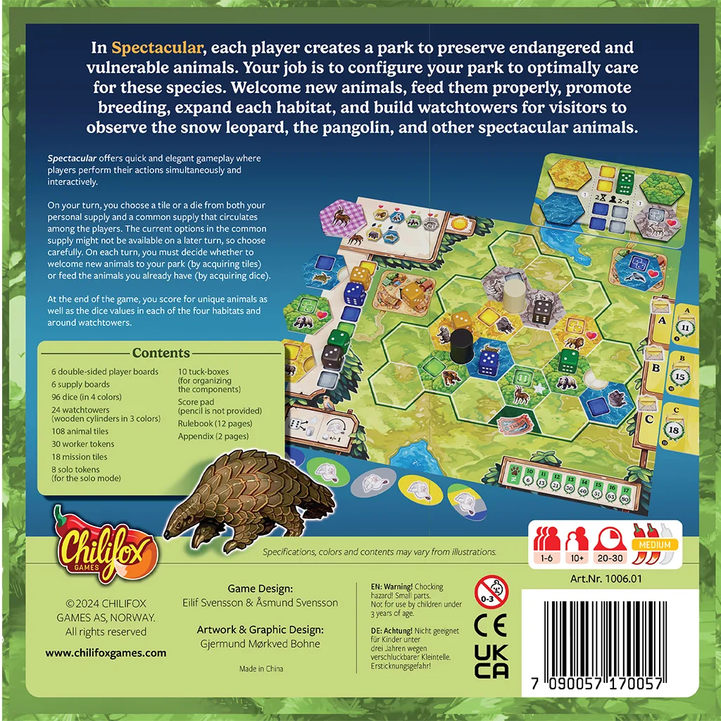 In Spectacular, you are creating and developing your own animal park for vulnerable species. In order to preserve the species, you must ensure breeding within each habitat. During the game, you select animal tiles and dice, where the dice represent food for the animals. The color of the dice must match the habitat color of the animal tiles. Each turn provides crucial decision-making where you need to consider whether to draft a die of a certain value or ensure an animal tile which may not be available again. At game end, for each area of connected tiles of the same habitat, you score points for the sum of your dice of that color. However, points are only awarded if dice values of 1 or 2 are placed on certain “family” tiles within the habitat! Over the course of the game, you will also build watchtowers, which will score you points for all three dice adjacent to them. To make your park even more spectacular, you also aim to collect as many different species as possible, with increasing points awarded for greater variety. Finally, the player with the most points wins the game.