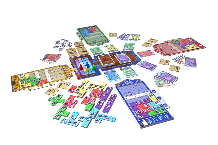 In Copenhagen, players design new façades for these houses so that they fit seamlessly into this beautiful harbor setting. On a turn, a player may choose to take two adjacent cards from the display (they may never hold more than 7 cards), or use cards to buy facade tiles in various shapes and colors. Any tile may be purchased, but you get a discount if you place a tile touching another one of the same color. Building over certain spaces or completing designated rows grants the players new abilities to make their job easier. Finishing a row or column will award the player points (doubled if it is all windows), and the game is a race to 12 points.