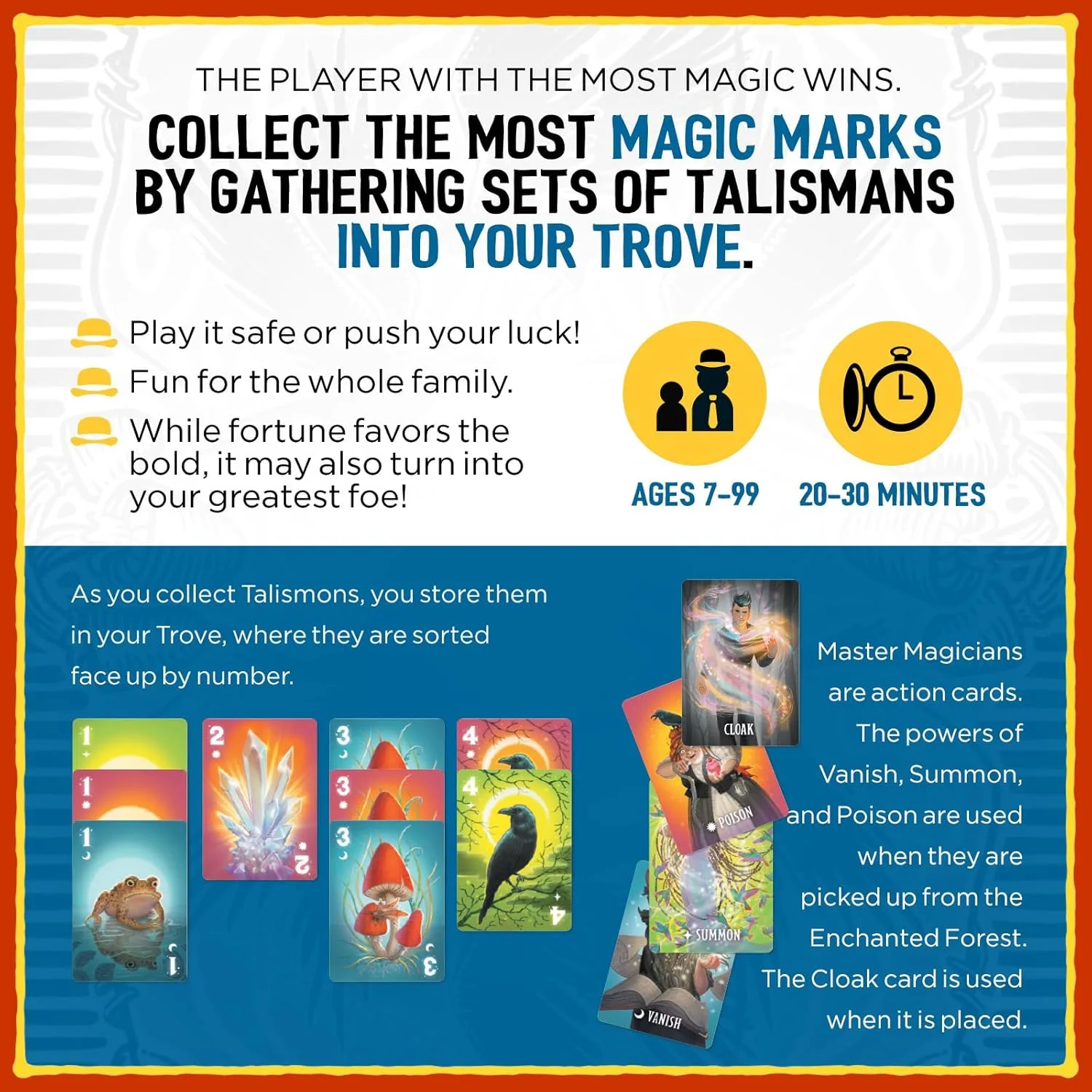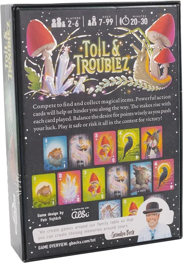 Compete to find and collect magical items. Powerful action cards will help or hinder you along the way. The stakes rise with each card played. Balance the desire for points wisely as you push your luck. Play it safe or risk it all in the contest for victory.