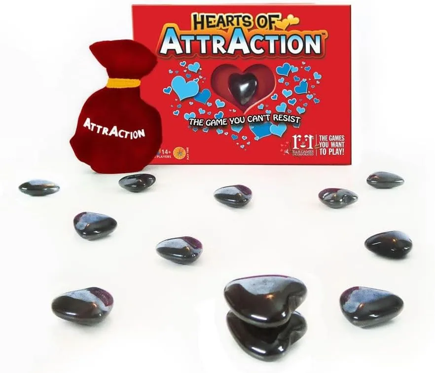 Hearts of AttrAction features the same gameplay as in AttrAction, but with heart-shaped magnets that put a new spin on shots. In the game, players must flick their "shooter" magnet into the playing area to attract and collect other magnets. Of course, it's not quite that easy since the magnets repel as easily as they attract! Strategies unfold and develop in reaction to the patterns on the table.