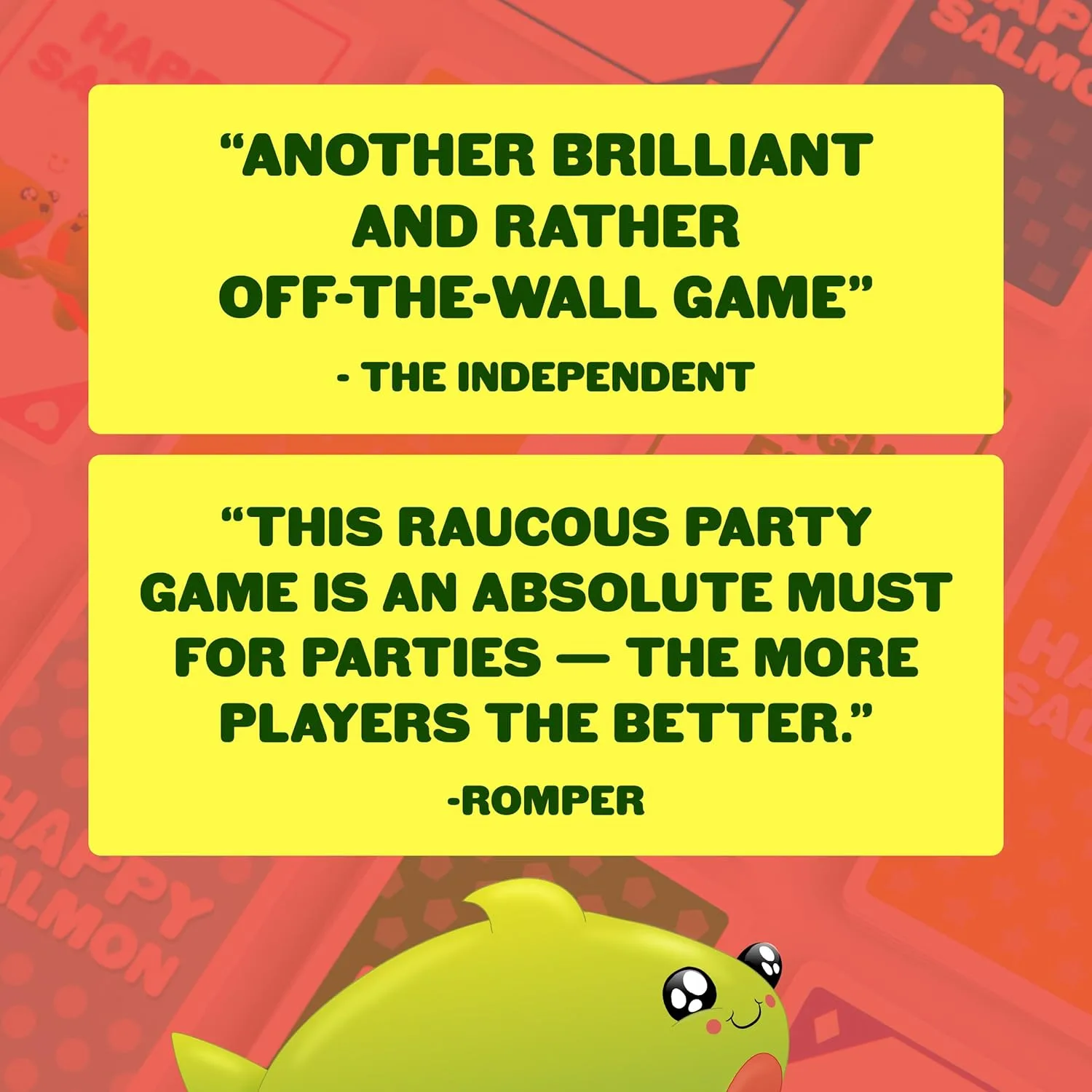 There are no turns. Players call out the action shown on their cards as fast as they can. When two players have a match, they celebrate by performing the action. Actions include the classic "High 5", the unifying "Pound It", the frantic "Switcheroo", and the delightful and bizarre "Happy Salmon". Each time a player celebrates a match, they quickly discard a card. The first person to get rid of all their cards wins.