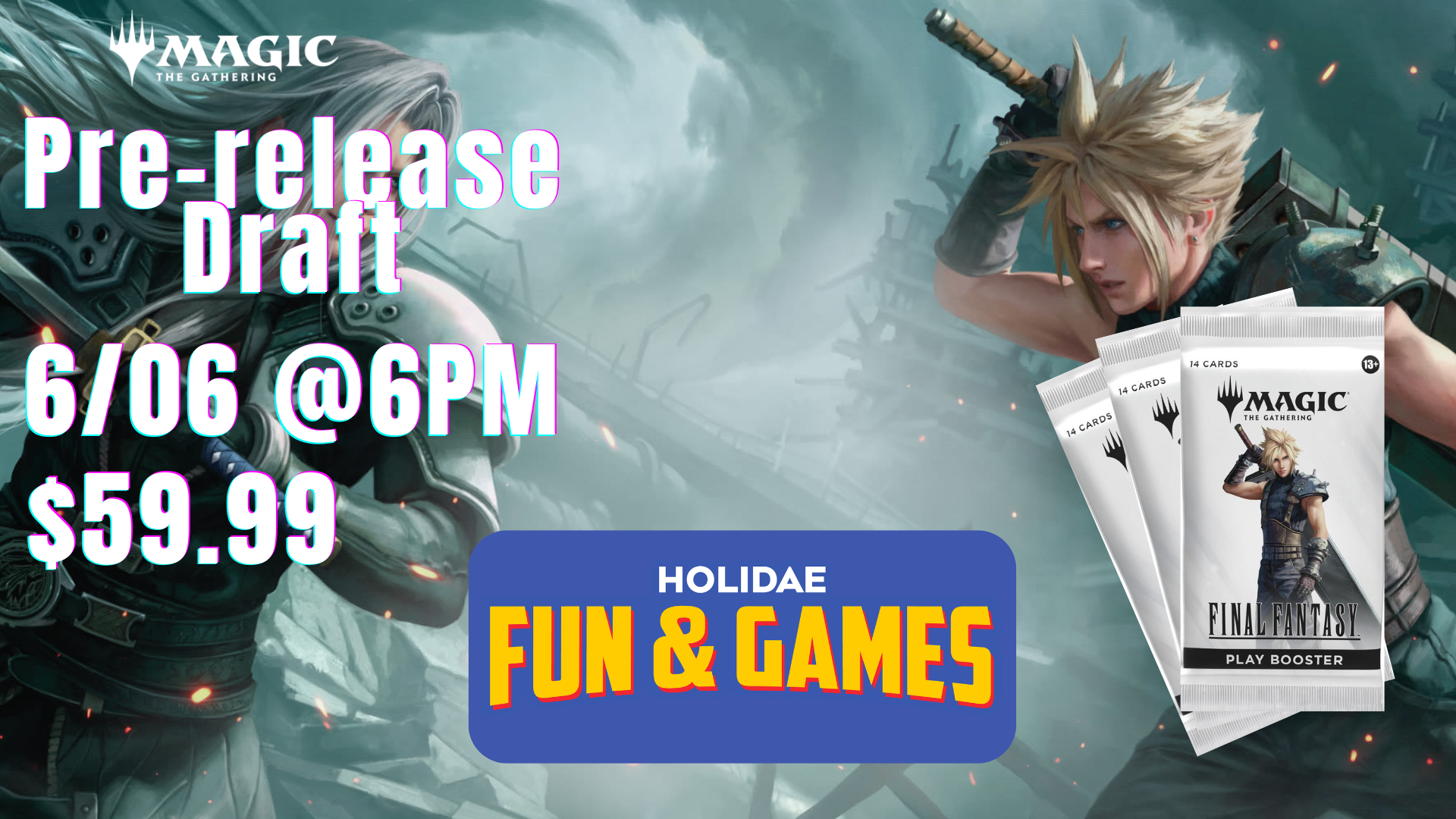 Join us June 6th at 7PM for our Final Fantasy Prerelease—our biggest event yet! Hosted at Fizz Rizz (32 College Ave, Rexburg), this epic night includes a prerelease kit, 2 additional play boosters from the new Final Fantasy set, a Fizz Rizz mocktail voucher, and a raffle ticket for exclusive prizes—all for $59.99. Doors open at 5PM for walk-in registration, kit building begins at 6PM, and round one starts at 7PM sharp. This event is capped at 128 players and spots are filling fast—prepay to guarantee your seat! Ages 12+ only. Don’t miss the chance to be part of this unforgettable night of cards, community, and celebration.